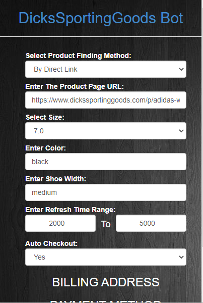 DicksSportingGoods bot is an auto checkout chrome extension bot. This auto-purchasing bot can add to the cart and auto checkout very quickly. It refreshes the page until the product is available on the dickssportinggoods website. Once the item is available, our auto DicksSportingGoods bot will check out very quickly.