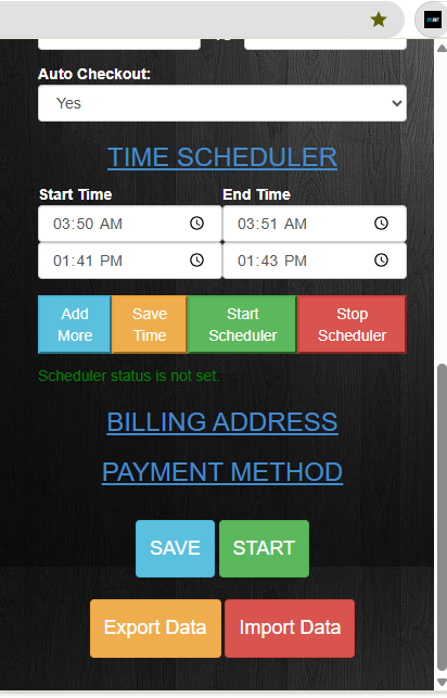 8. Click on Billing Address then it will expand then enter Billing Address details then check the Shipping Address the same as billing then click on payment method so it will expand then select a payment method and put Payment Information then Save the Information and Start the bot.